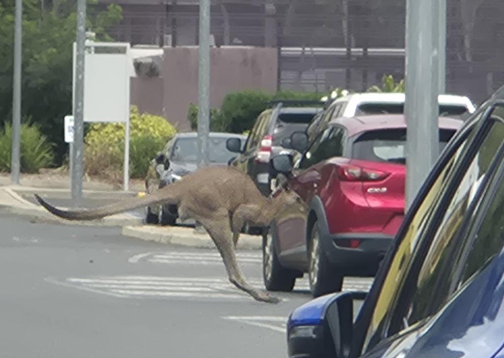 Oh, I was leaving work the other day and a few kangaroos were hanging out under a tree next to the parking lot. By the time I realised how big they were and got my camera out, two had already hopped through the parked cars and I only just caught this one hopping by: