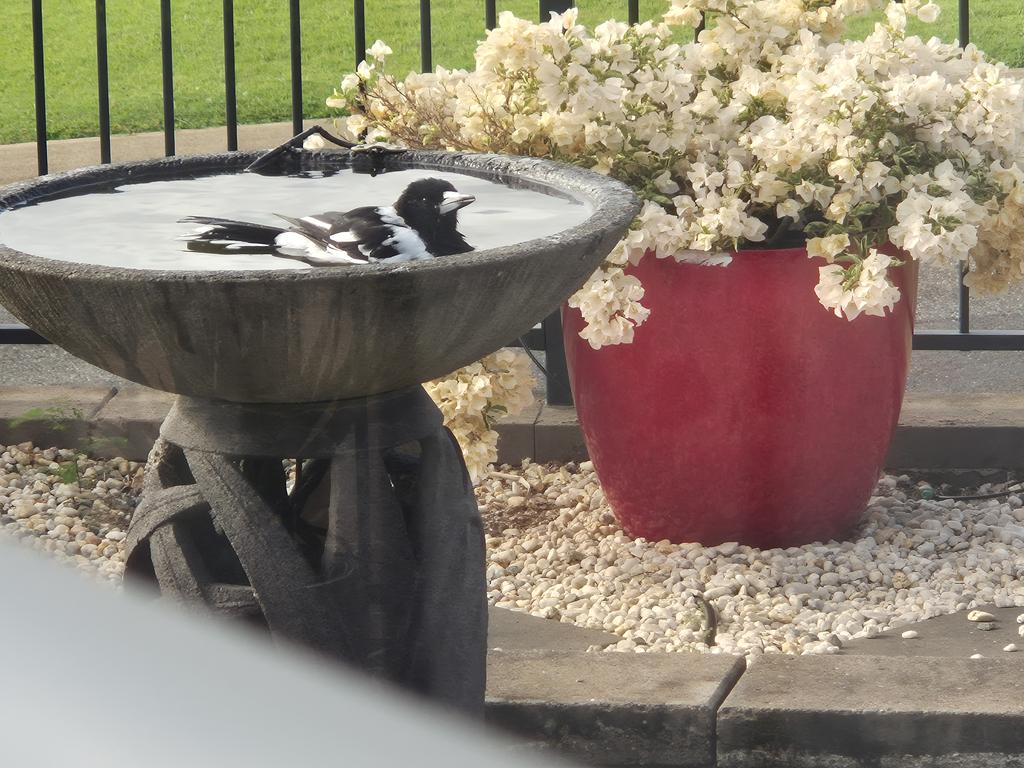 This is my favourite songbird, the Pied Butcherbird, taking a bath (and check out all the flowers on our white bougainvillea in the backgound!). We’ve always had Pied Butcherbirds around the house but for some reason, they only started hanging out around the bird bath in the last 6 months. I love having them around!