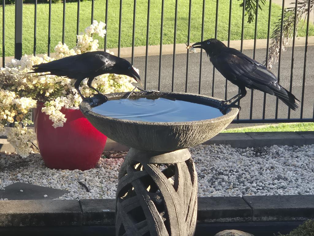 Here are some crows marinating their bread in our bird bath: