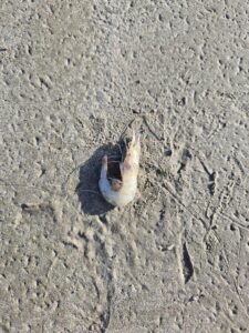 Yes, a prawn (note that this is why Aussies don’t really say “shrimp on the barbie” – because they’re called prawns here :)). Now my question about this is – could it be a prawn that was living in the sea and got blown in with all the high winds/waves we’ve had lately, or did someone drop part of their lunch on the sand?