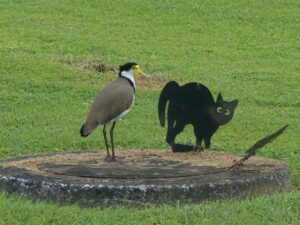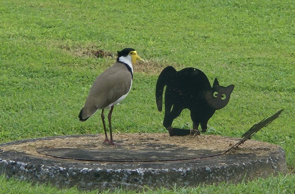 This one’s hilarious – Tavie, I think you’ll get a kick out of it! Plovers (also known as Masked Lapwings) are curious birds. They build their nests on the ground, usually close to the road or sidewalk. Then they get cranky with you if you are anywhere near them – and they have spurs under their wings to attack you (just build your nest somewhere normal, like in a tree, and you wouldn’t have to deal with cars and bikes and pedestrians, sheesh!). Because of their nesting and defense habits, people try putting fake cats in their yard. One of our neighbours does this, but apparently it’s not terribly effective: