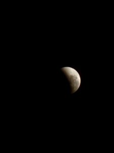I’ve been taking an online course in photography using my Samsung phone. Many picture-framing techniques I sort of knew already, although didn’t know they were techniques, I just thought things looked better a certain way. But I’ve been learning lots of other little tips that I’ll put to use one day (I’ve created a little instruction booklet to refer to, but the reality is, I just take photos and don’t really think about it). One thing I really wanted to learn was how to take photos of the night sky because my photos are always just blurry. I started that module of the course but then wanted to wait to finish it until I had time at night and could try things out as it taught them. I still haven’t done that but when we had the lunar eclipse this week, I went out to see if I could get a decent photo. I tried taking a couple photos as the eclipse was beginning and the shadow was creeping up from the bottom of the moon toward the top, but they didn’t turn out. I then took one when the eclipse was full and a lovely colour of red, but it was still blurry around the edges. Then Hugh came out and indicated that I wasn’t in telephoto mode and needed to zoom more. Eureka! I hadn’t realised there was a bit of a pause/lag when you went past the normal 12x zoom and transitioned to the telephoto lens. So every time my phone stopped zooming further, I thought that was as far as it would go – wrong!! So I was then able to get decent photos as the eclipse was ending: