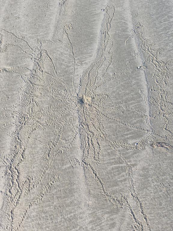 Hugh and I have continued our regular beach walks and still frequently encounter new sights. One old sight, which I just love seeing, are the patterns made by crabs digging in the sand and kicking up sandballs: