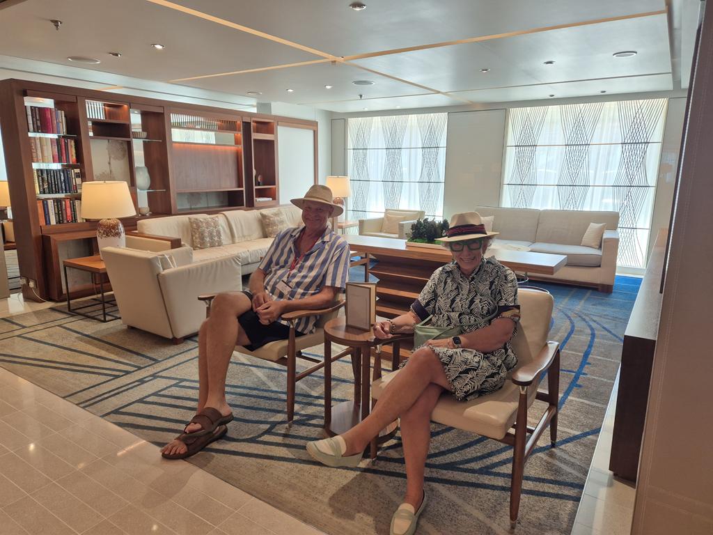 Mom was able to get visitor passes for Hugh and I to board the cruise ship and have lunch on board. The ship is the Viking Sky and is quite awesome! Smaller than most ships these days, just 800 passengers, but really beautifully designed. Lots of nooks like this all over the place: