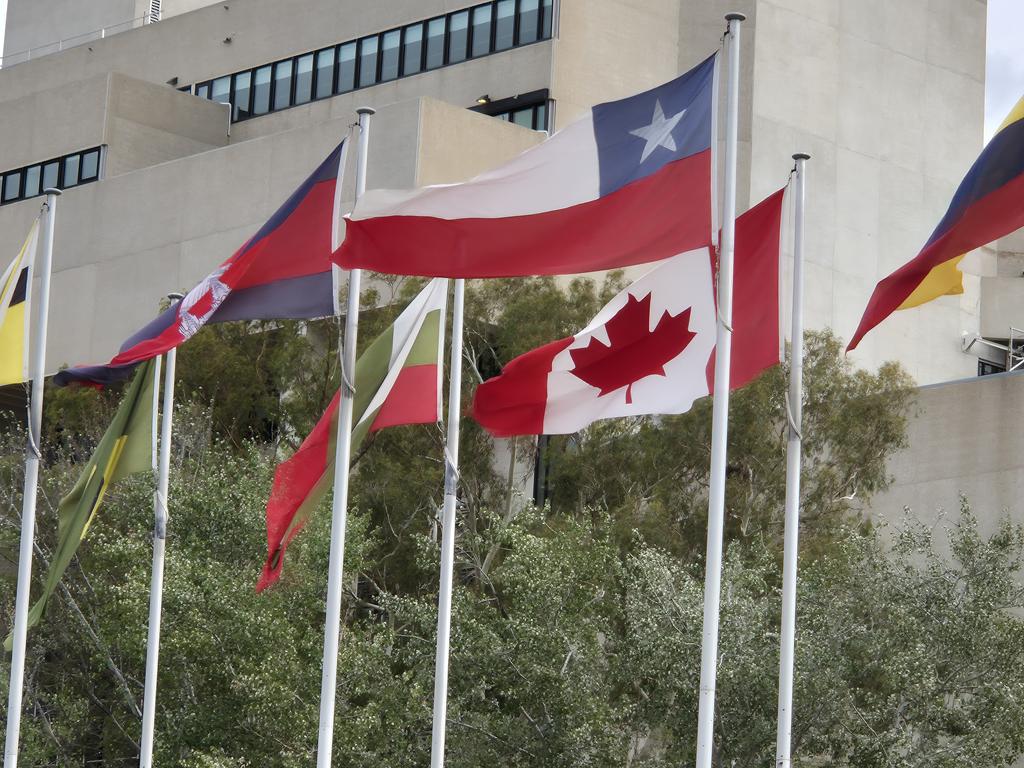 Notice the one in the middle? Are you thinking it’s the Canadian flag? Wrong! If you click on the photo and zoom in, you can see it’s not a maple leaf in the middle. No idea what country it is (Peru, maybe?), but this had us going for awhile because we had also seen a Canadian flag on the other side and couldn’t figure out why there would be two! The flags of the world are arranged in alphabetical order. Here’s the correct Canadian flag: