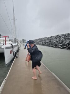 I mentioned in an earlier blog that we’d had an unusually rainy/windy summer here. One day, we got together with Rod, Llew, Rob, and Barb at the marina and we mis-timed heading back to our cars and got caught in the driving wind and rain. Here is Llew, trying unsuccessfully to not get drenched: