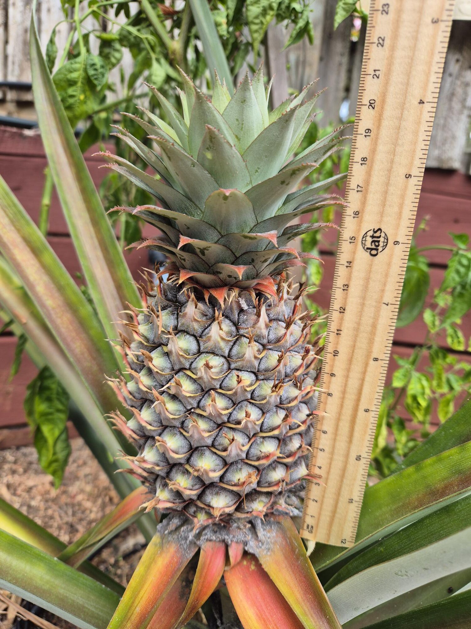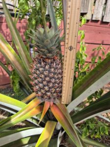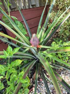 Good news – we have another pineapple growing! Hugh has planted pineapples randomly around the yard (you just cut the top off a pineapple and stick it in the dirt – and then wait patiently for 18-24 months for them to grow). You’ll recall my excitement when the first one in the front yard was growing so nicely, only to be decimated by some sort of bug. Well, our second one, in the backyard, is doing better than the first!