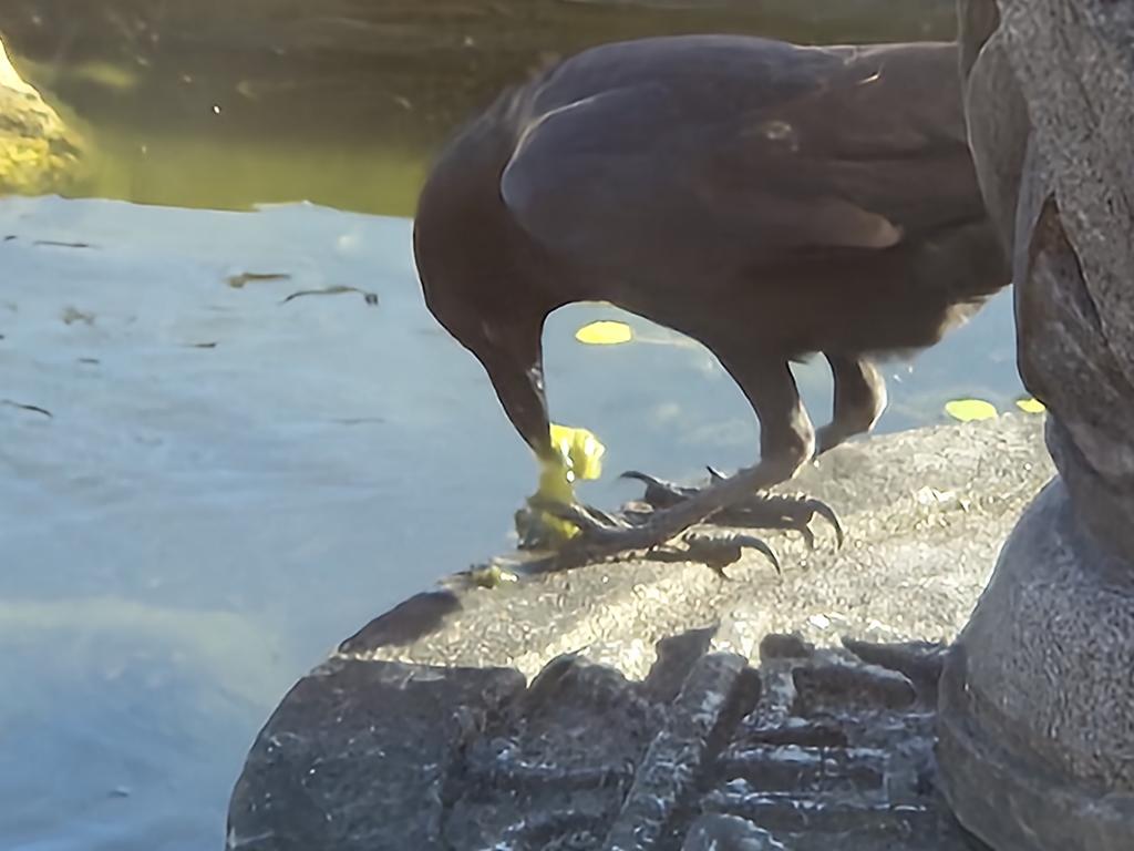 He would use his beak to grab some algae (pronounced with a hard ‘g’ here, not a soft ‘g’) from the water, then use his claws to hold it on the concrete while he pulled it apart with his beak to eat.