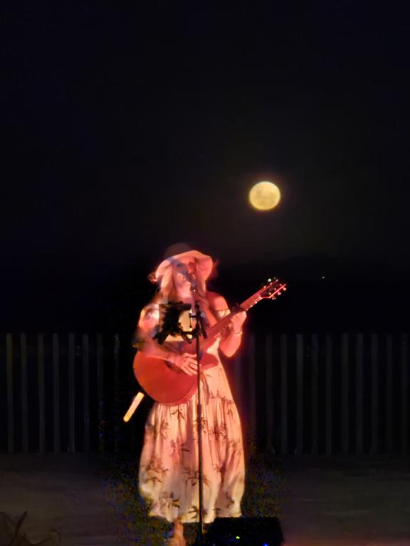 In other moon photos, our friend Sarah was playing at Tides N Tunes down at the foreshore during the full moon and I got this photo of her with the moon rising in the background: