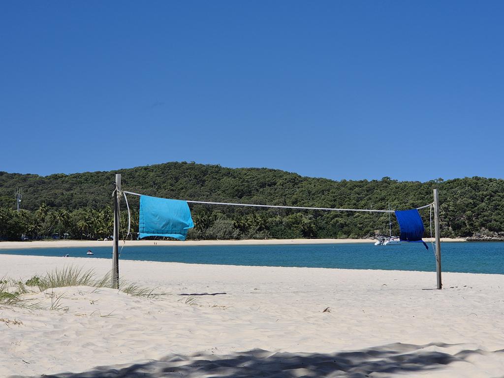 When we were coming back to the island from the glass bottom boat tour, the water was a bit wavy and I wasn’t thinking and left our beach bag on the floor of the boat – and a big wave splashed in and most stuff in the bag got soaked. But not to worry, when we got to the island, we just hung the towels on a volleyball net and enjoyed a coffee in the shade while they dried: