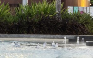 On one of our beach walks, we saw a bunch of seagulls taking advantage of the water sprays at the Yeppoon Lagoon public pool: