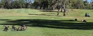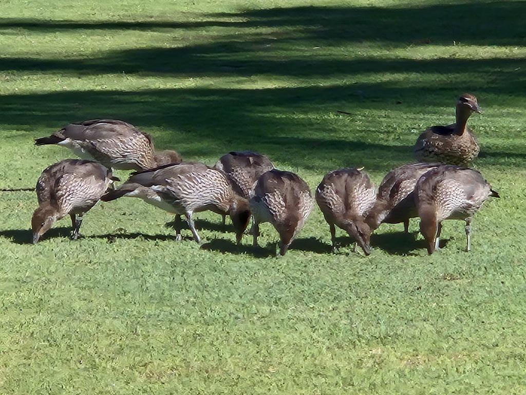 I thought it was sort of neat to see both kangaroos and ducks on a golf course (you can see the kangaroos off to the right in the shadows). As I was taking the photo, Jo was leaving the golf course and she yelled over, “is that for the blog?” (she knows me, most photos I take are for the blog). I asked Jo if she knew what these were and she very helpfully responded with “ducks” (I seriously need to find better friends… :)). But then she looked more closely and said, “oh, that’s the brown-spotted duck.” Right, like I was going to believe that. So I was dreading looking them up in case they were actually called brown-spotted ducks but fortunately, they are Australian Wood Ducks (which Jo did eventually suggest, when she was done “taking the piss” (another Aussie phrase)).