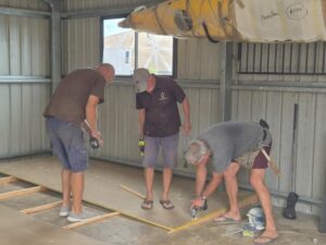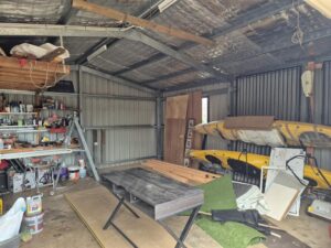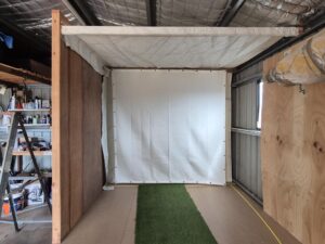 Before talk of the Stimulator became serious, Hugh had already hung a net and sail (old one from Kevin’s boat) in the shed and would occasionally hit balls into it from a piece of cheap astro-turf:
