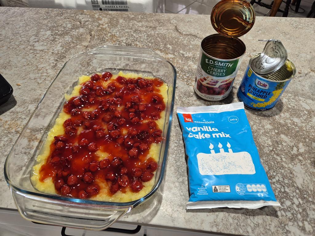 Speaking of baking, when our friends Glenn and Nancy came to visit last September, we asked them to bring a couple cans of cherry pie filling (because fruit pies do not exist here, cans of cherry pie filling do not exist here). Hugh made a cherry cheesecake with the first one when we were watching the NRL Grand Final last October. Yesterday, I used the remaining can (‘tin’ here) to make my favourite dessert, dump cake: