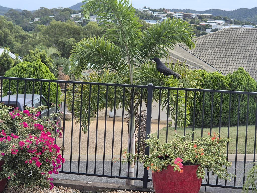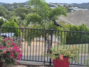 This one this morning tried hanging out in our Foxtail Palm, but he’s a bit big for the fronds to support him well: