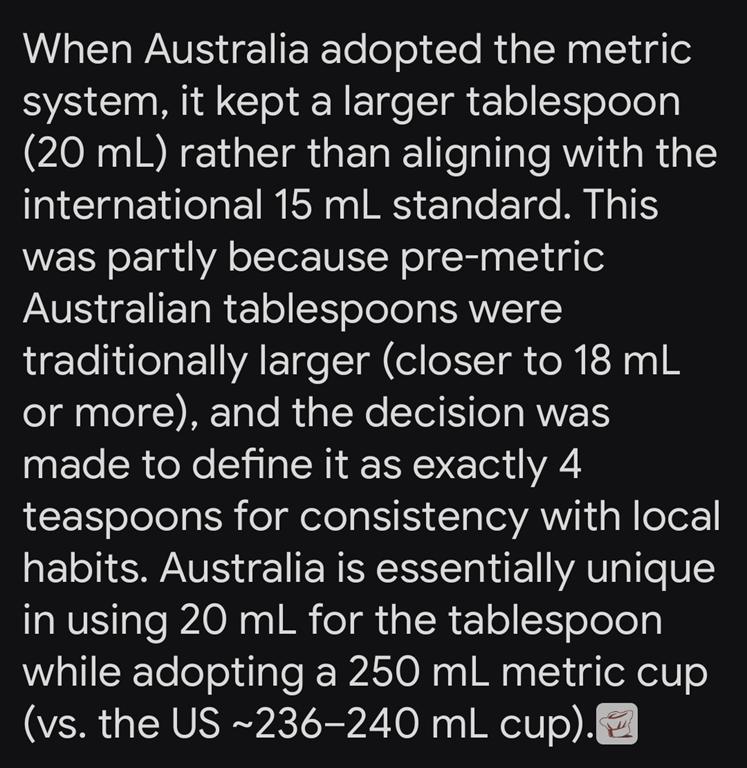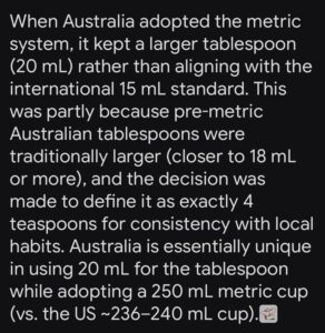 A fun fact that my friend Toni recently taught me is that a tablespoon measure in Australia is not the same as elsewhere in the world. Here is an explanation from Grok: